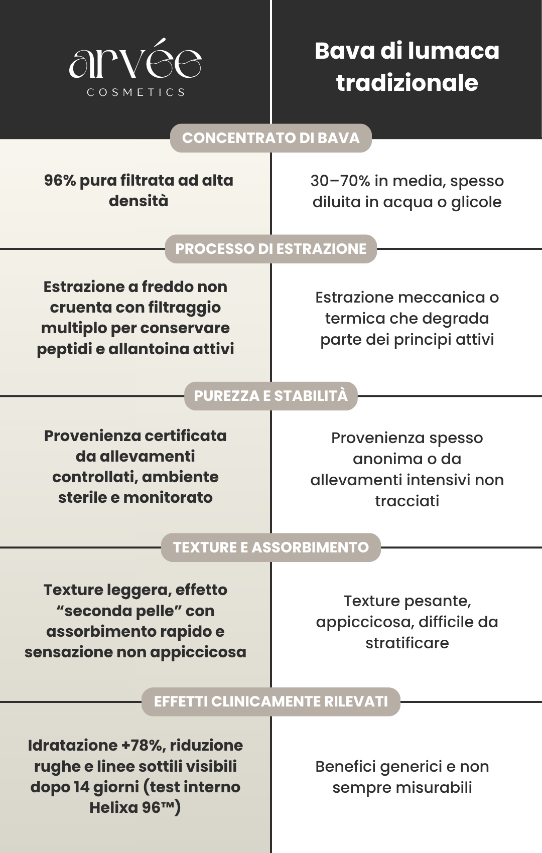 Solo bava di lumaca pura, non diluita, mantenuta nella sua struttura biologica originale per massimizzare rigenerazione e idratazione.